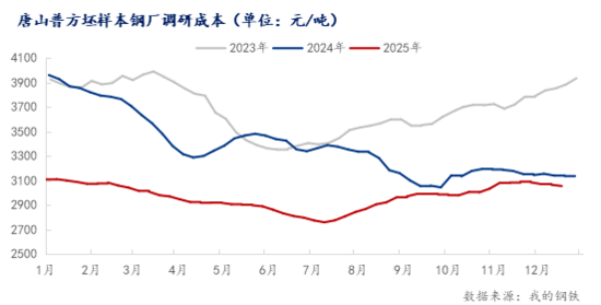 本周唐山主流樣本鋼廠平均鐵水不含稅成本為2293元/噸,平均鋼坯含稅成本3055元/噸,周環(huán)比下調(diào)10元/噸,與12月19日當(dāng)前普方坯出廠價格2950元/噸相比,鋼廠平均虧損115元/噸。
