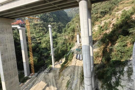 材料車輛無法直達坡高崖陡的部分點位,如一些陡崖上的樁基、隧道洞口,項目團隊通過天泵、地泵或塔吊運轉混凝土,并在不同高度安設了三臺吊車,將建筑材料一級一級吊裝、運轉、架設。