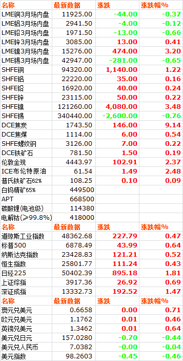 1222日,LME六種基本金屬價(jià)格漲跌互現(xiàn)。三月期銅價(jià)收于11925美元噸,上漲0.37%。三月期鋁價(jià)收于2941.5美元噸,下跌0.12%。三月期鉛價(jià)收于1971.5美元噸,下跌0.66%。三月期鋅價(jià)收于3085美元噸,上漲0.41%。三月期錫價(jià)收于42947美元噸,下跌0.65%。三月期鎳價(jià)收于15276美元噸,上漲3.20%