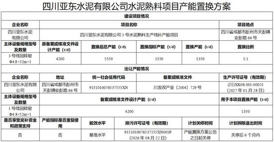 四川亞東水泥有限公司3號水泥熟料生產線原備案或核準文件設計產能4200t/d,置換指標產能1350t/d,置換產能1350t/d,置換后總產能5550t/d,置換比例為1:1。