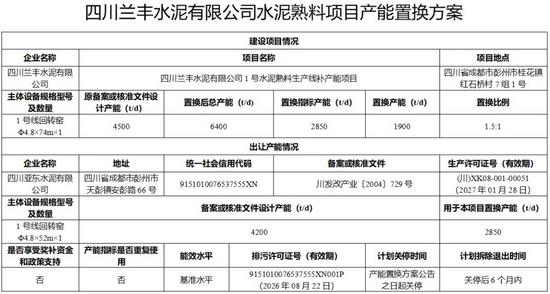 四川蘭豐水泥有限公司1號水泥熟料生產線原備案或核準文件設計產能4500t/d,置換指標產能2850t/d,置換產能1900t/d,置換后總產能6400t/d,置換比例為1.5:1。