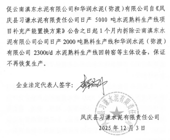 鳳慶縣習謙水泥有限責任公司日產5000噸水泥熟料生產線原備案或核準文件設計產能4000t/d,補充產能1000t/d,置換產能1500t/d,置換比例為1.5:1。云南滇東水泥有限公司一條2000t/d水泥熟料線和華潤水泥(彌渡)有限公司2300t/d水泥熟料線中的1300t/d用于本項目置換產能,兩條生產線均計劃本方案公告之日起1個月內拆除退出。
